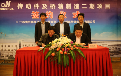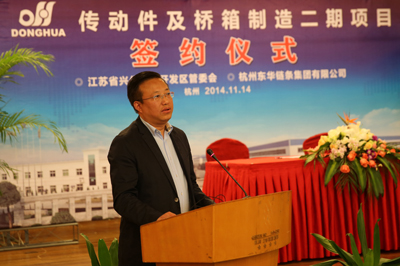 簽約儀式上,董事長宣碧華致辭。他說,東華2007年收購興化齒輪廠,至今已有8年,一直得到了興化市委、市政府和興化開發(fā)區(qū)的大力支持,使一個當(dāng)時不太景氣的企業(yè),得到了新生、發(fā)展。現(xiàn)在不僅是鏈條行業(yè),齒輪、鏈輪、變速箱、橋箱將同步發(fā)展。今天簽約的興化這個項目,我們考慮了東華發(fā)展的增量和存量。增量是我們希望到2020年生產(chǎn)總量翻一番,興化的這個土地就是我們的增量空間。存量有兩塊,一是原來我們在外采購的原材料、零部件,拿回來放在興化生產(chǎn),保證質(zhì)量;二是現(xiàn)在臨平三廠區(qū)制造鏈條要退二進三,騰籠換鳥,把騰出來的廠房做新的項目,比如傳動件超市、輸送機械、CVT變速箱,所以今天我們在這兒舉行簽約儀式,對東華來講是一個很好的發(fā)展機會,具有里程碑意義。