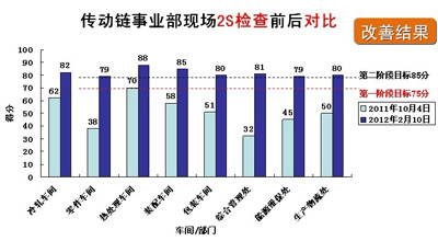 2S管理明顯提高并標準化作業(yè) 通過2S的運行,傳動鏈事業(yè)部員工的現(xiàn)場2S意識和管理都得到了明顯提升,如包裝車間現(xiàn)場管理的雜亂改善到目前的現(xiàn)場流程規(guī)范、通道流暢、物品擺放整齊等,熱處理車間設備運行狀態(tài)可視化等;同時廣大員工學會了總結(jié)與標準化操作,如現(xiàn)場檢查標準化、任務改善驗證標準化、管理點檢標準化、現(xiàn)場作業(yè)標準化等。