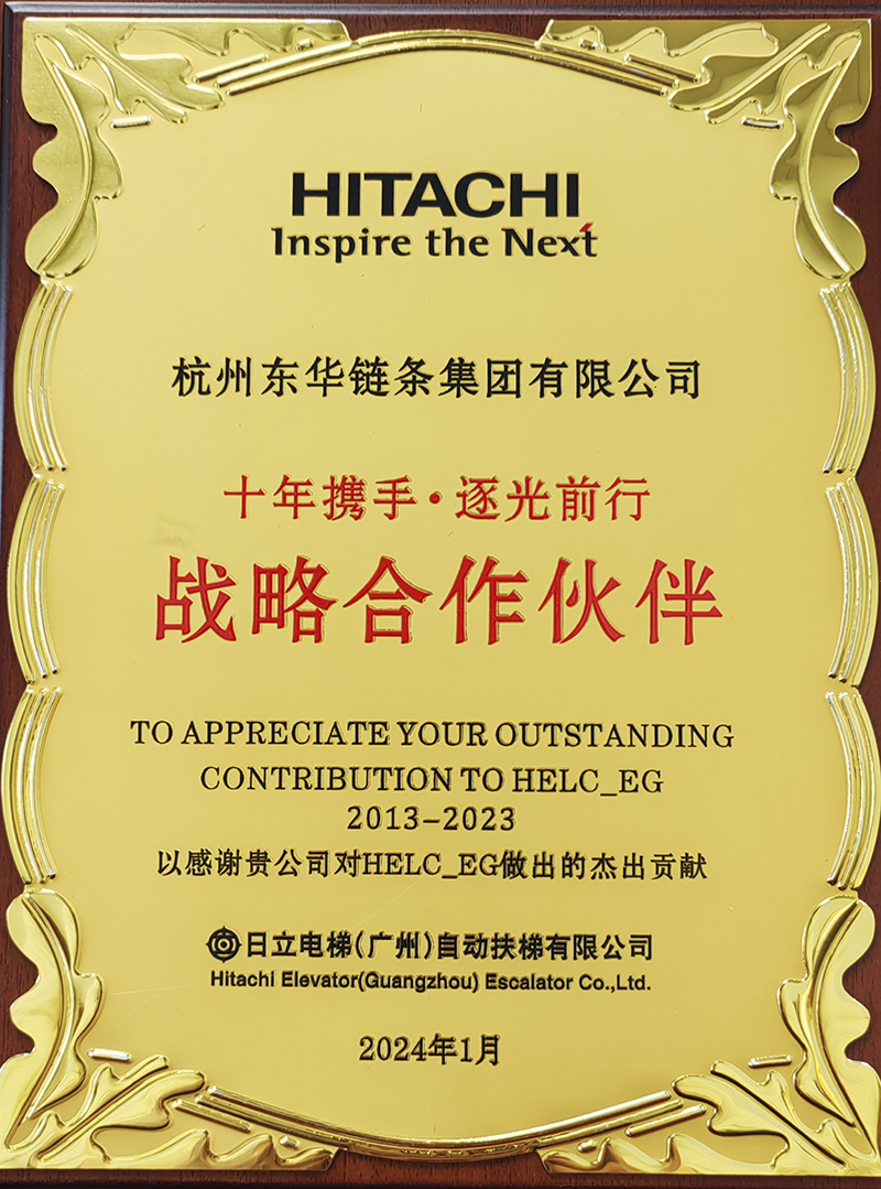 日立電梯(廣州)自動(dòng)扶梯有限公司是東華的重點(diǎn)配套主機(jī)客戶,其配套產(chǎn)品涵蓋商用梯、公交梯,雙方在多年的合作中已建立了良好的合作基礎(chǔ)。2023年,扶梯工程鏈?zhǔn)聵I(yè)部積極實(shí)施細(xì)分市場冠軍戰(zhàn)略,堅(jiān)持專業(yè)化、系統(tǒng)化、高端化和高質(zhì)量發(fā)展的定位,不斷開發(fā)和滿足日立電梯的需求,積極走訪市場,在產(chǎn)品制造過程中嚴(yán)控工藝、提升交付率,在產(chǎn)品質(zhì)量上更是精益求精,全方位提升服務(wù)。此次東華獲得2023年度突出貢獻(xiàn)獎(jiǎng)和戰(zhàn)略合作伙伴獎(jiǎng)是日立電梯(廣州)自動(dòng)扶梯有限公司對(duì)東華扶梯鏈產(chǎn)品質(zhì)量的高度肯定,也讓我們對(duì)2024年服務(wù)好客戶信心倍增。