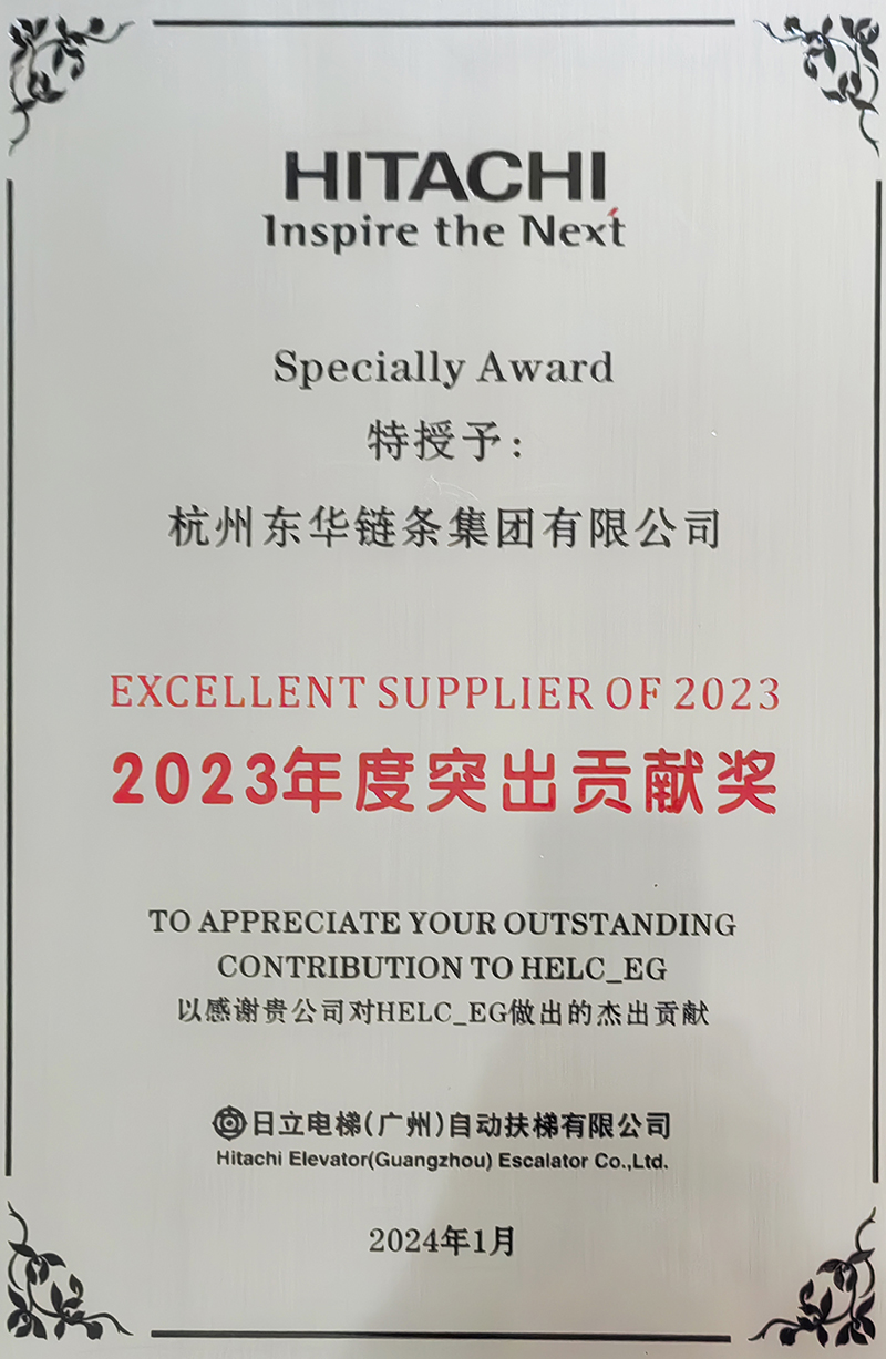1月12日,在2023年度日立電梯(廣州)自動(dòng)扶梯有限公司供應(yīng)商大會(huì)上,東華鏈條集團(tuán)獲日立電梯2023年度突出貢獻(xiàn)獎(jiǎng)和戰(zhàn)略合作伙伴獎(jiǎng)。扶梯工程鏈?zhǔn)聵I(yè)部總經(jīng)理汪希上臺(tái)領(lǐng)獎(jiǎng)。